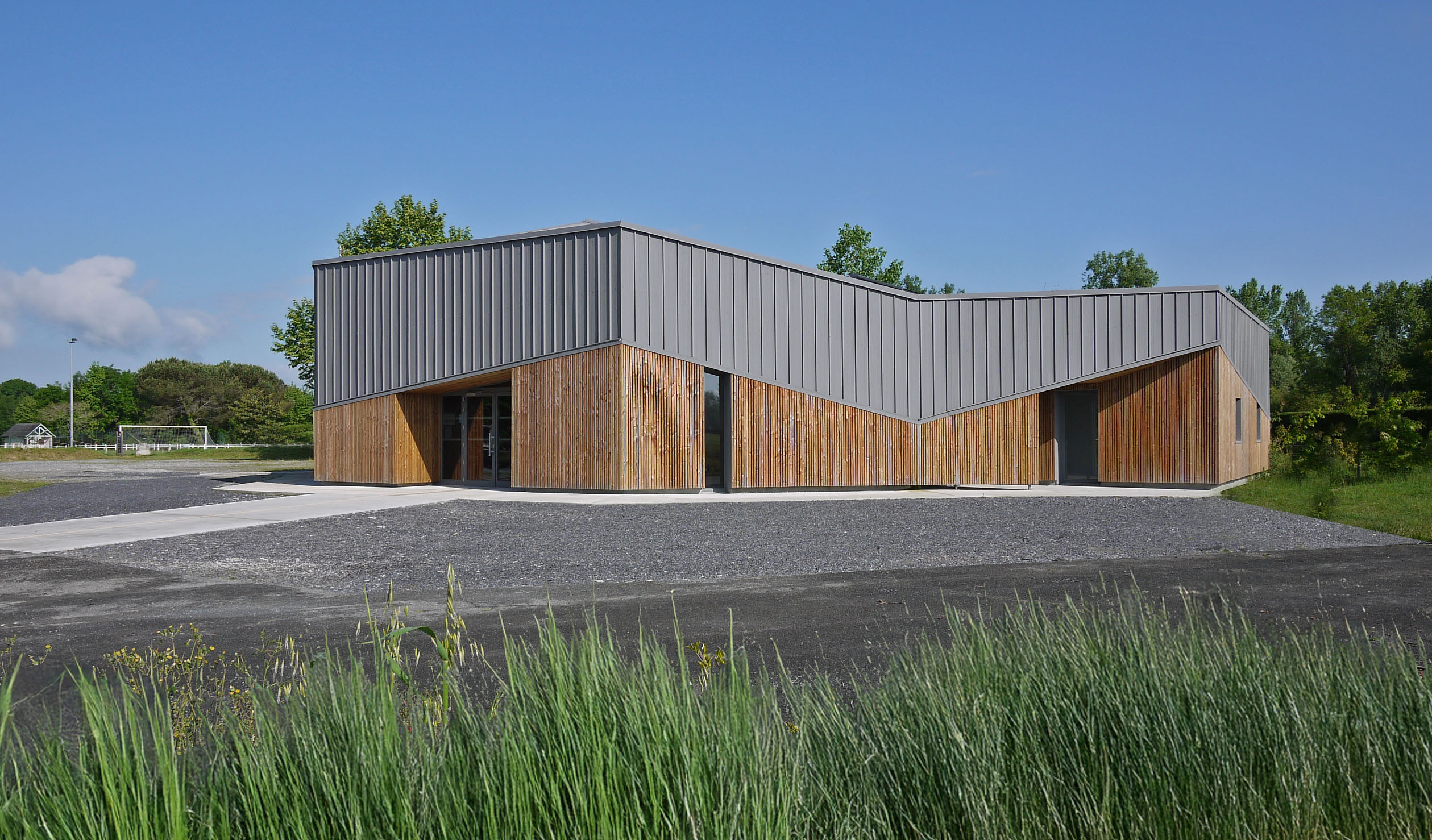 Le parti pris a été de déstructurer la vision des volumes avec une ligne brisée qui fait le tour du bâtiment, s’inclinant à chaque face, et séparant une partie inférieure en bois à claire voie et une partie supérieure en bac métallique imitation zinc (que l’on retrouve également en façade).