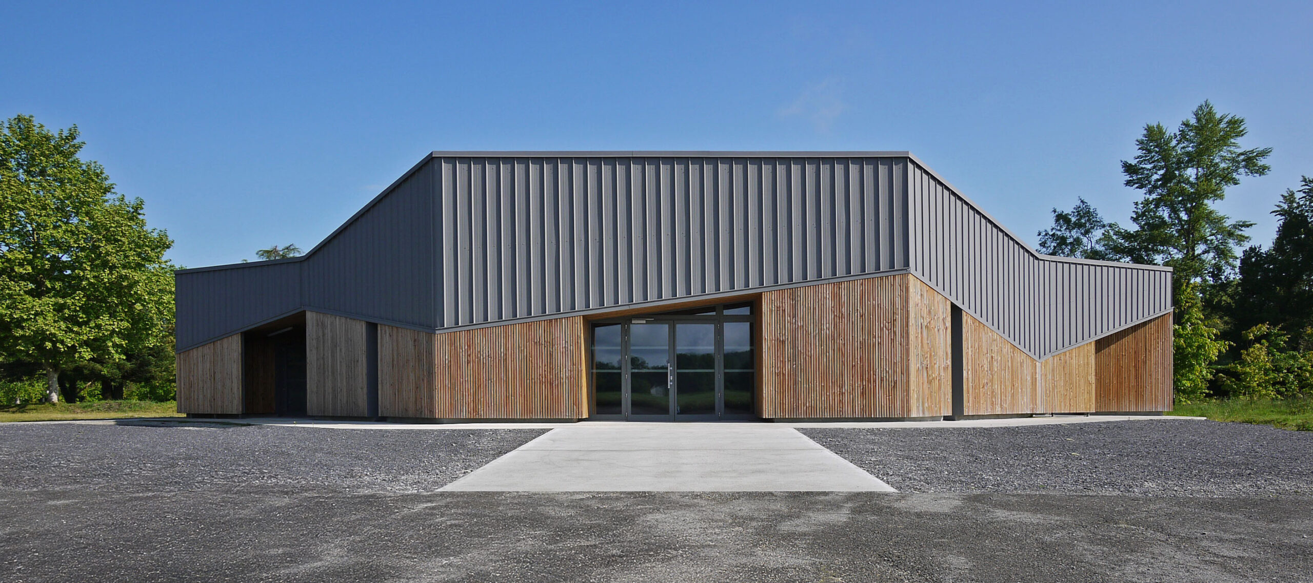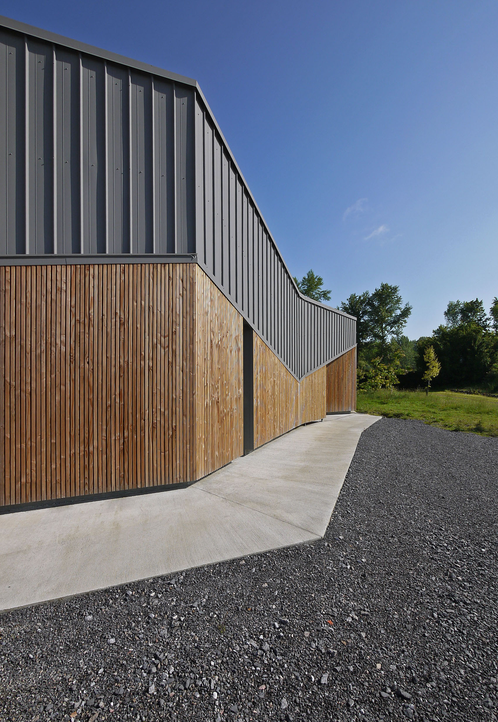 Le défi architectural consistait à produire une architecture contemporaine sur une forme de base très atypique, marquée par un plan octogonal, une toiture métallique à 2 pentes prolongées sur les ailes et des ouvertures rectangulaire à pointe.