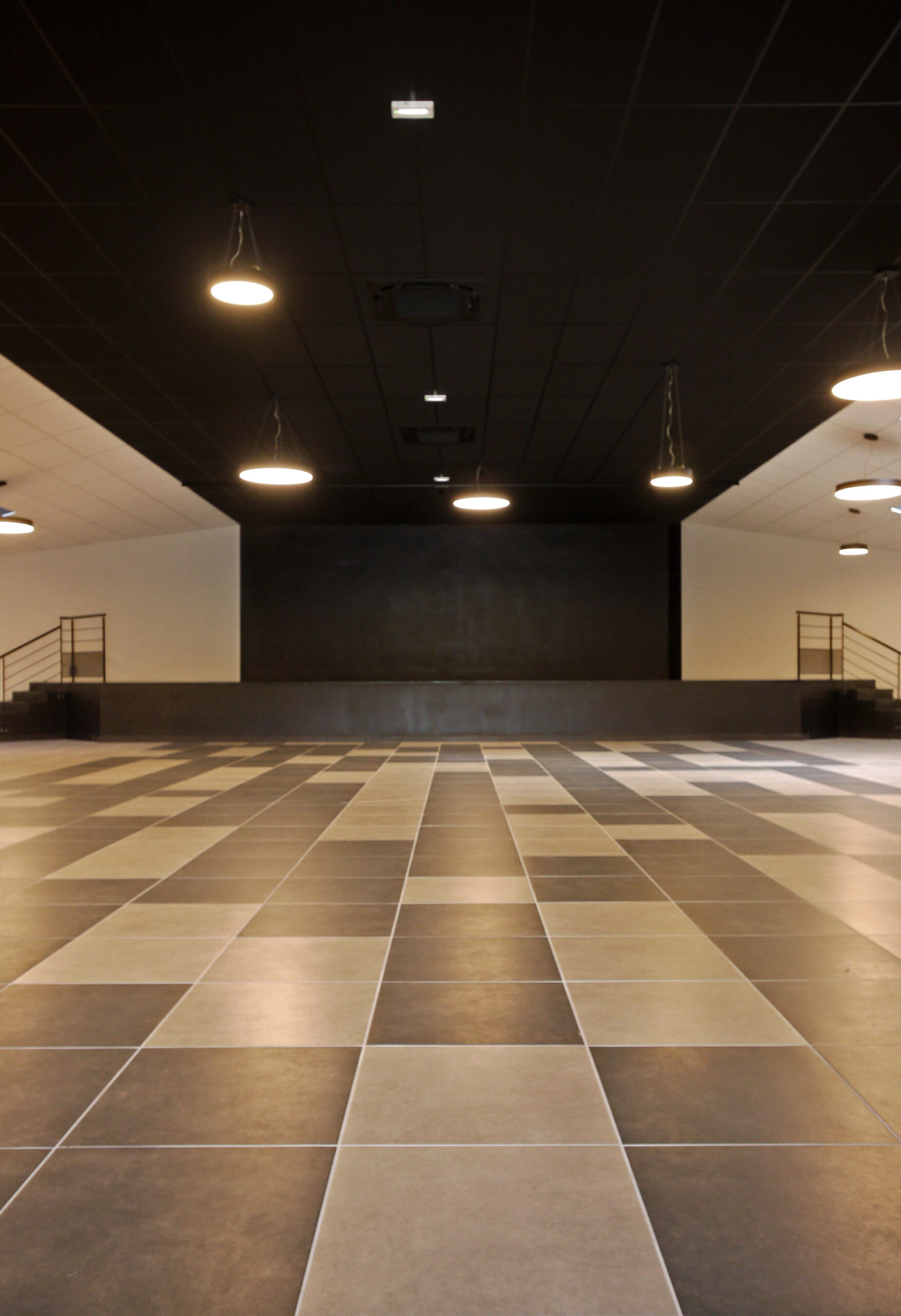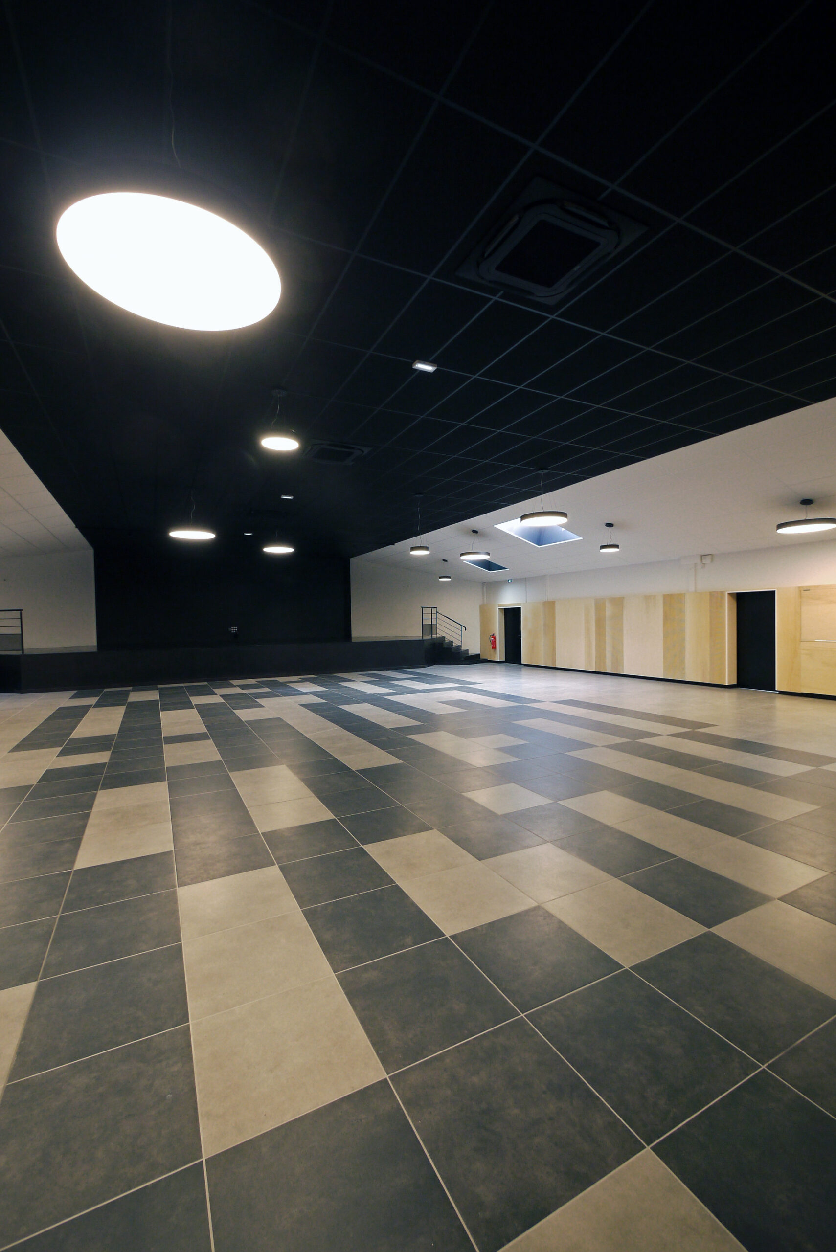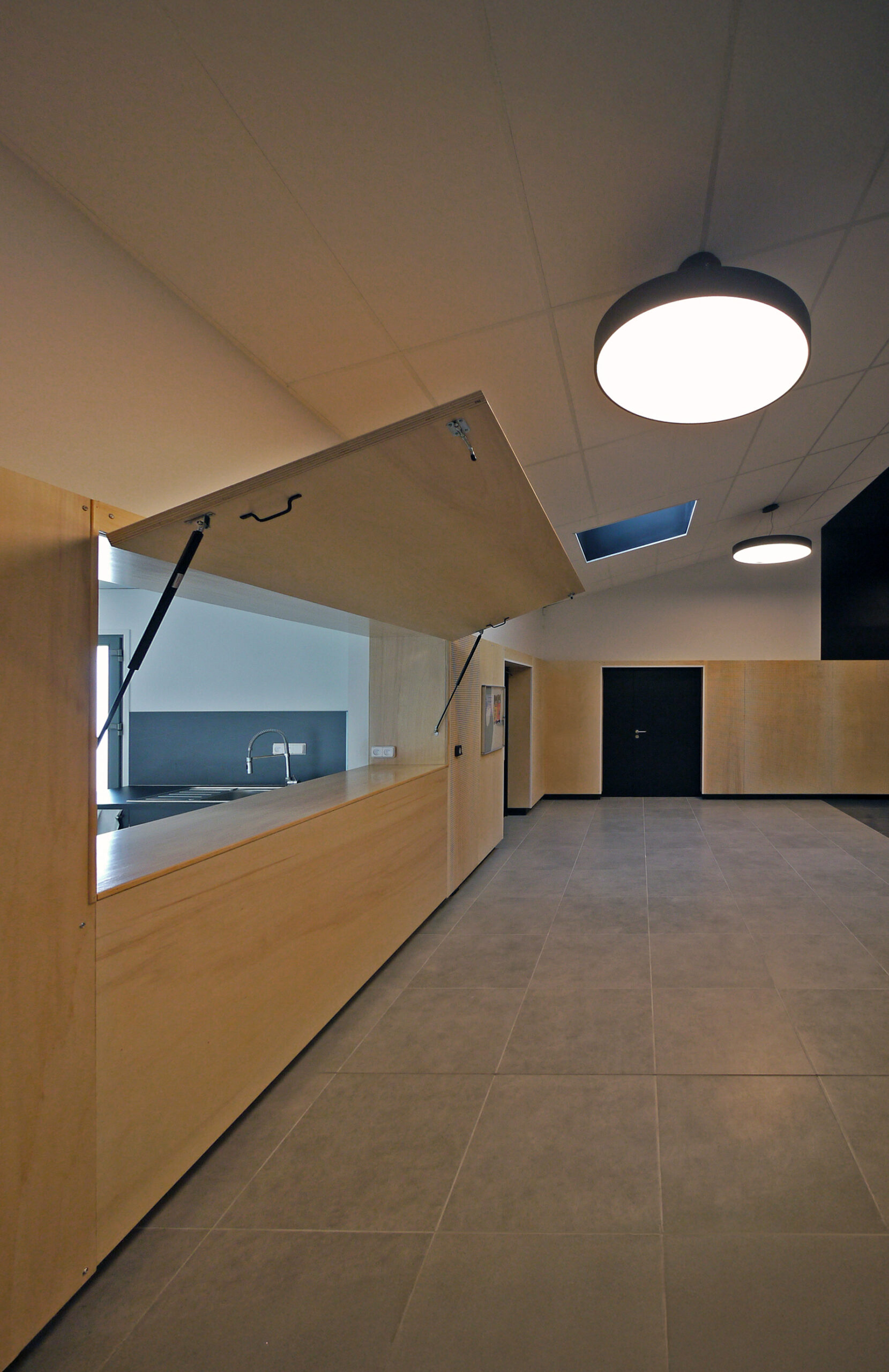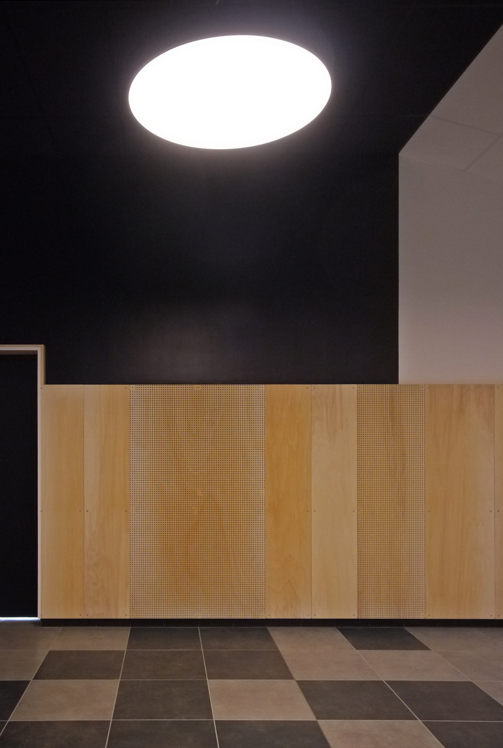 A l’intérieur on retrouve ce soubassement en bois dans la grande salle, réalisé en panneaux de bois contreplaqué dans une alternance de panneaux pleins ou perforés, permettant à la fois une protection aux chocs, une acoustique améliorée ainsi qu’une esthétique contemporaine et naturelle.